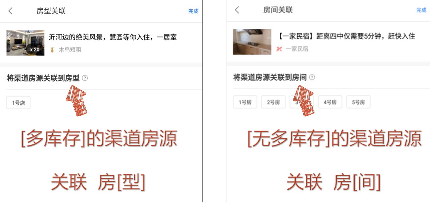 多库存房源关联到房型,独立房源关联到房型对应的房间。